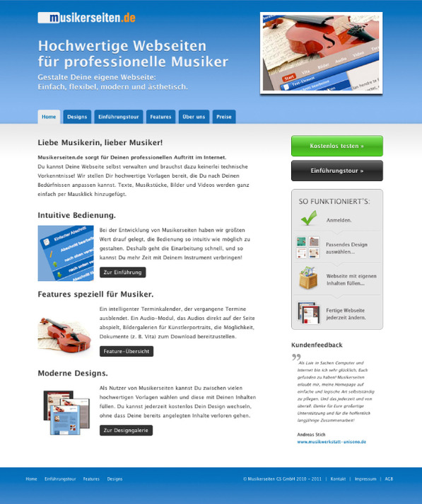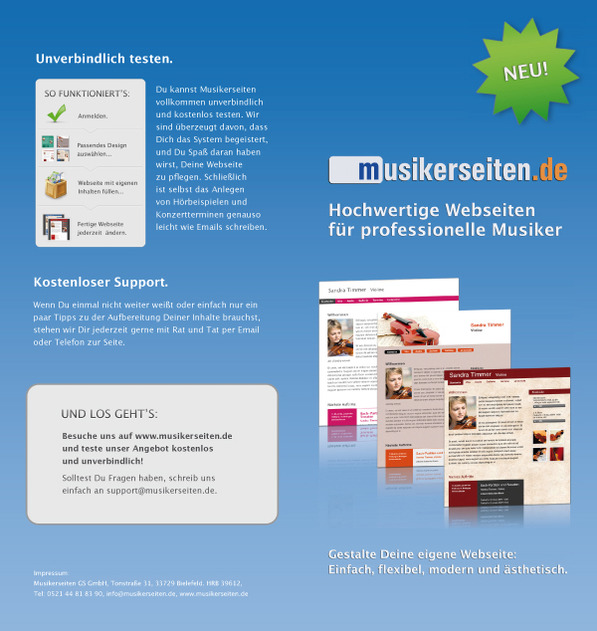 Die Plattform musikerseiten.de bietet professionellen Musikern (und anderen Selbstständigen) eine einfache Möglichkeit, zu einer eigenen Internetpräsenz zu kommen.